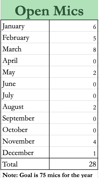 My goal of 75 mics this year was stupid. Anyone who has done stand-up comedy in New York City knows open mics are a grueling process. For me, the average experience is spending 45 minutes on the subway to get to the mic, waiting ~60 minutes to perform, eating shit, and then spending 45 minutes on the subway to get home. To subject myself to that 75 times in one year was just too much for me.