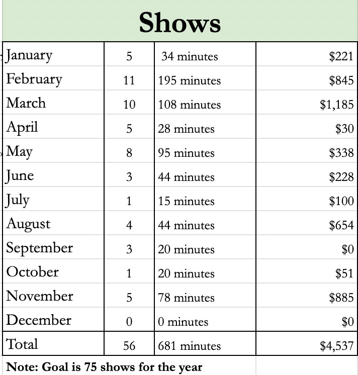 I am not close to being able to quit my day job. I am grateful for the money I made performing live comedy in 2024 - $4,537 is a nice chunk of change. But in order to match my salary at my day job, I’d need to make about $55,000 more than that. (If anyone knows any stand-up gigs that pay $55,000, please email me at jonathanvanhalem at gmail dot com.) The good news is these things tend to happen all at once, so once you reach that threshold, you kind of blow past it.